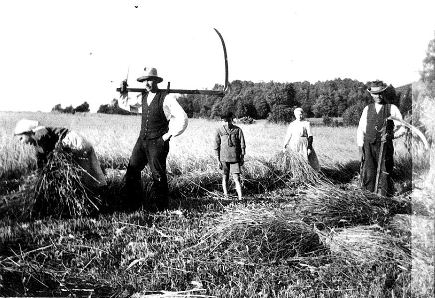 Hel havreåker mejas för hand. Svea, Karl, David, mor Anna, far Johan Thylen.