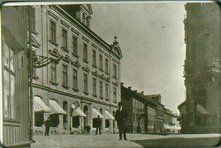 Storgatan, vid S:t Olofsgatans korsning. T.v. hörnet av Jouvins hotell. I förgrunden Bruno Larsson på spritbolaget.