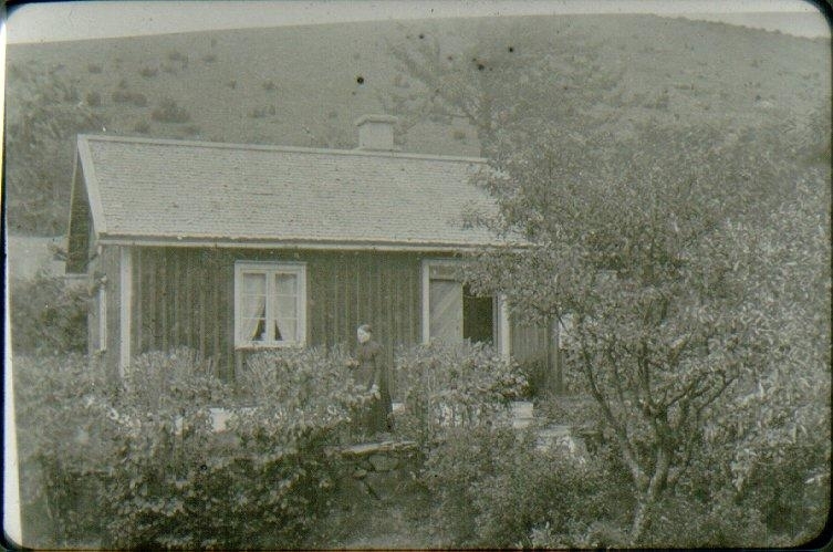Britta Persson utanför sin stuga i Bestorp. När doktor Wersén slutade sin anställning som överläkare vid Mössebergs badanstalt och sanatorium och öppnade praktik i Stockholm, köpte han denna stuga och iståndsatte den och trädgården.