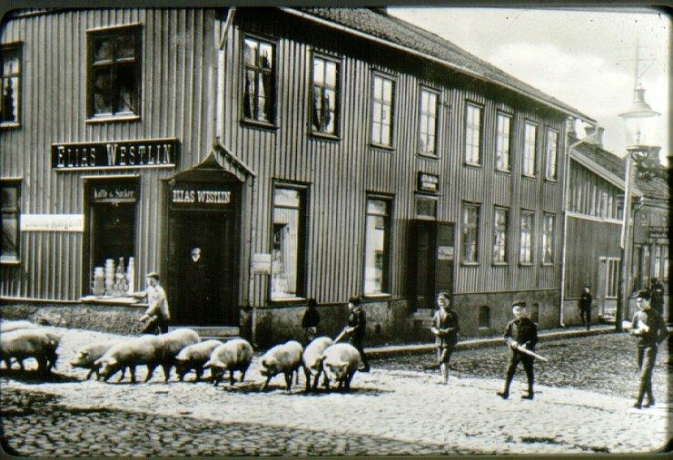 Småpojkar vallar grisar framför Storgatan 15 i Falköping.