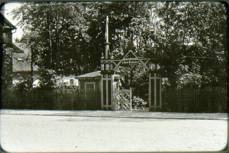 Ingången till hotellträdgården mitt emot Rantens station omkring 1920. Efter det att tomten såldes till fosterlandsstiftelsen, omändrades entrén.