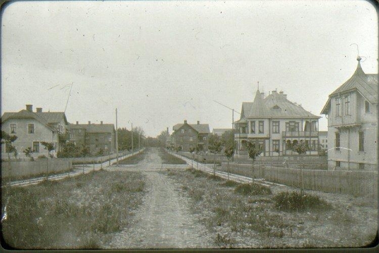 Parkgatan mot söder. Närmast t.h. kv. Tor 15, Odengatan 13. Närmast t.v. därom kv. Borgmästaren 17, Odengatan 33, borgmästare Brummers-Kocks hus. Längst t.v. kv. Borgmästaren 18, Odengatan 14, dr Erikssons hus. Från sekelskiftet.