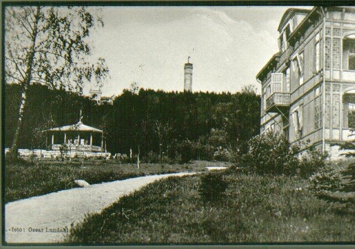 Mössebergs kurort, Vintersanatoriet och restaurang Hasselbacken. I bakgrunden Bredablick och utsiktstornet.