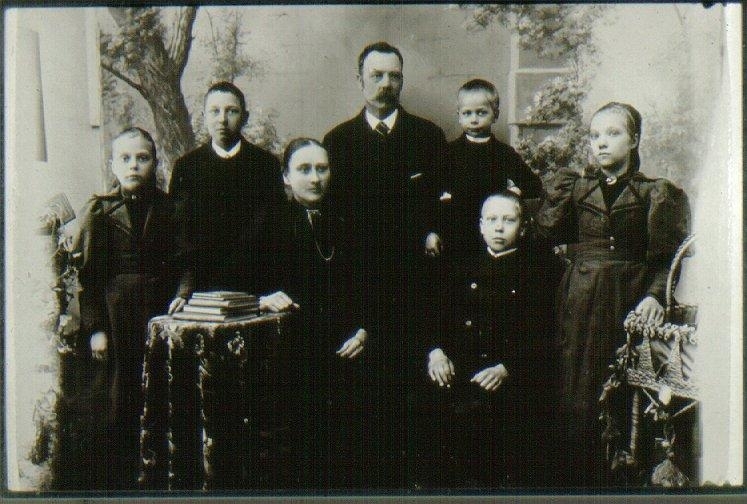 Nummer från vänster 1. Tekla Gustafsson 2. Torsten Gustafsson 3. Albertina Gustafsson 4. Fredrik Gustafsson 5. Rudolf Gustafsson 6. Vilhelm Gustafsson 7. Ingeborg Gustafsson. Fredrik Gustafsson hade spannmålsfirma.