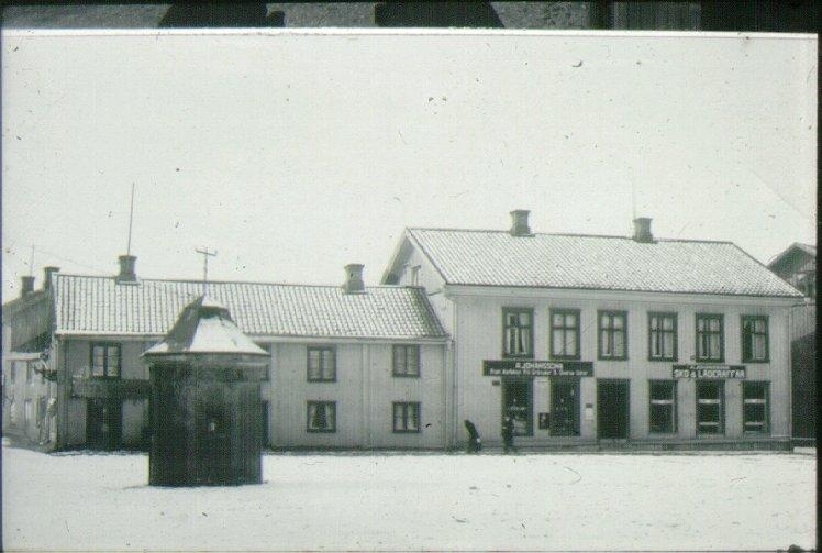 Stora torget. "Lumpejonsons" fastighet i hörnet mot Trätorget. Taxikiosken borttagen senare.