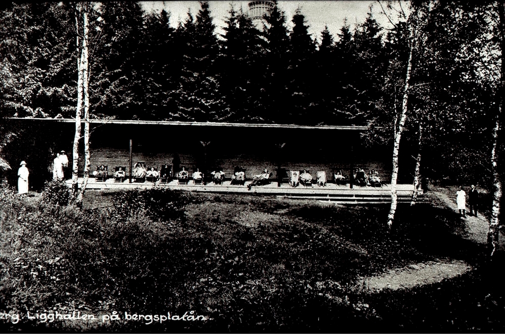 Mössebergs sanatorium. Ligghallen på högsta bergsplatån, solbad.