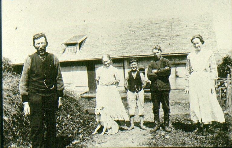Folkagården, Friggeråkers sn, 1914. Från vänster: Lars Johan Thorin, hans hustru Sofia-Gustava, Birger Thorin, Edvard och Olivia Thorin.