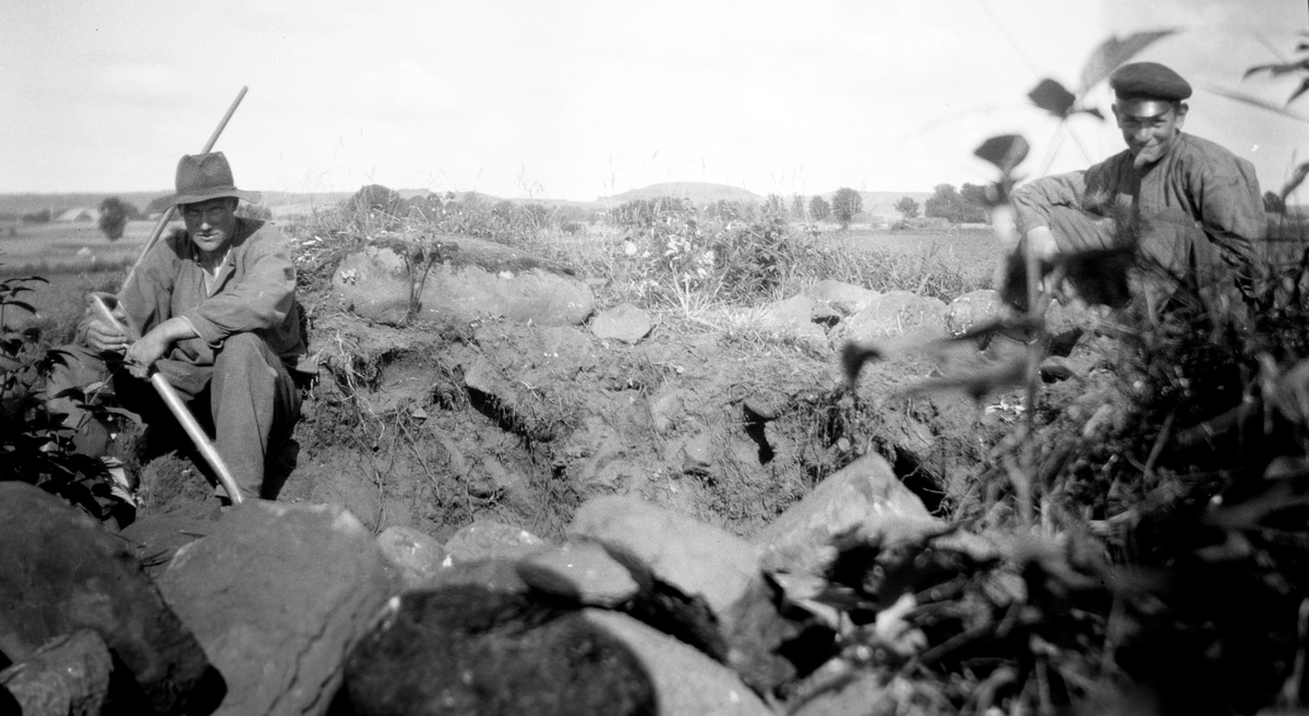 Utgrävning av förmodat röse på Nya Åsle gård, Några obrända ben hittades. Nu bortodlat.