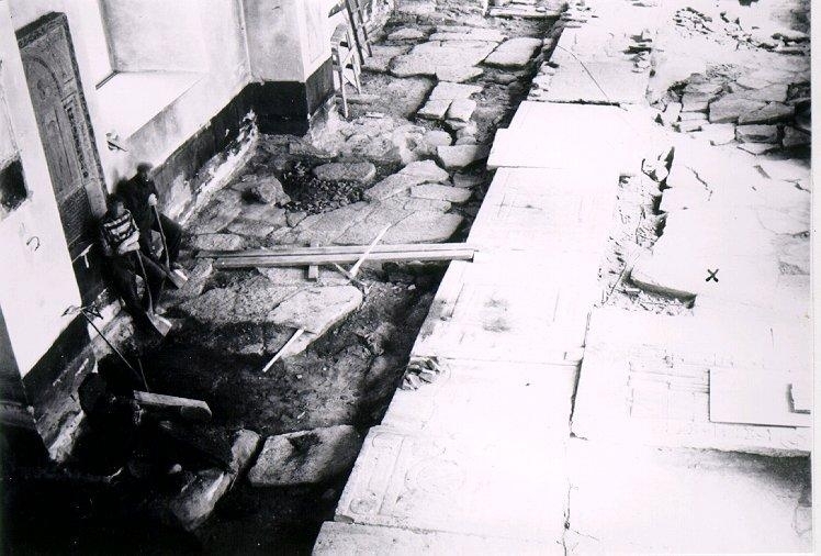 S:t Olofs kyrka. Undersökningen 1950-62. Gravstenarna i långhuset "in situ".
