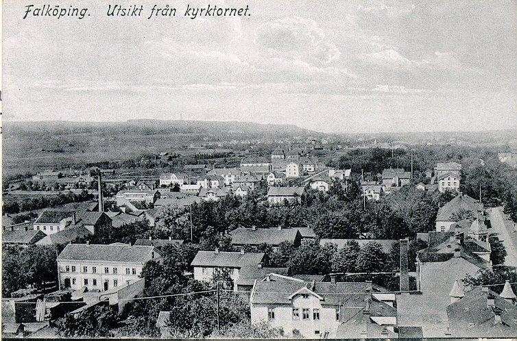 Utsikter från kyrktornet. Till vänster Trädgårdsgatan 10 (f.d. gymnastiken till läroverket), Haglunds fabriker, Läroverket, Planteringsförbundets park, S:t Olofsgatan med Jouvins hotell. Bankhuset, S:t Olofsgatan 19 (Kalvhagen), S:t Olofsgatan 21, det ljusa tornet längre ned tillhör Johanniskyrkan.