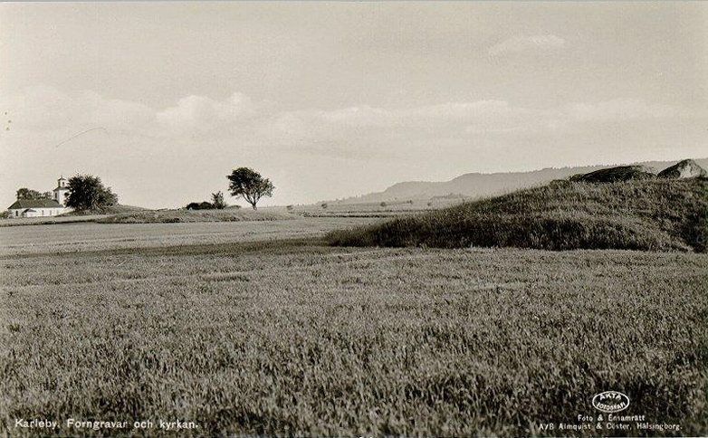 Fornlämningsmiljön i Karleby. De på rad liggande gånggrifterna och kyrkan i bakgrunden.