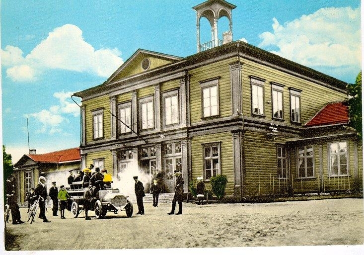 Omnibussen avgår från Rantens station, Falköping. Färgllagt foto.