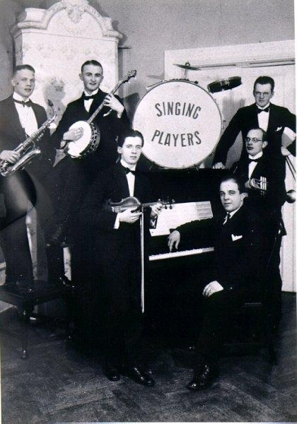 Dansband. Falköpingsorkestern "Singing Players" på K3:s Officersmäss i Skövde omkring 1930. Från vänster: Johannes Andersson, Alvar "Putte" Sandberg, Lars Halldén, Gösta Olsson, H. Kullberg och Gösta Alexandersson.