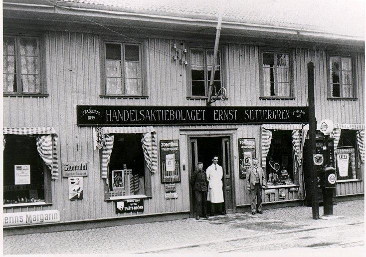 Ernst Settergrens affärsfilial, Järnvägsgatan. Tre män: Yngve Sundbäck, Bertil Karlsson, Viktor Högvall.