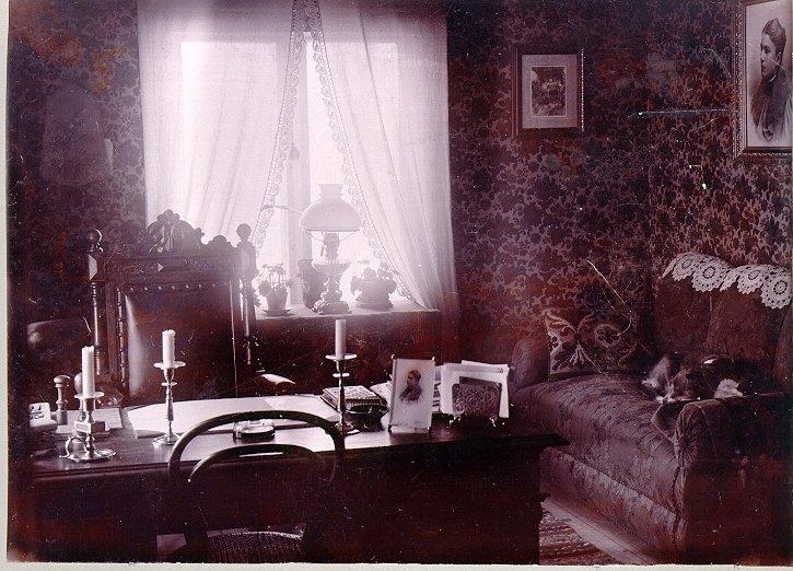 Hassla 1905. Farbror Bries arbetsrum. Tavlorna är faster Gerdas foto samt interiör från Habo kyrka.