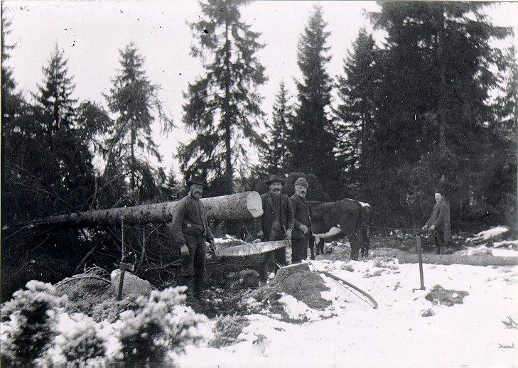 Korsgården. Personer från vänster: Josef Sandahl, Gunnestorp, Levin Johansson, Gunnestorp, August Johansson, Korsgården, Anton Johansson, Aspelund. Oxarna är från Aspelund.