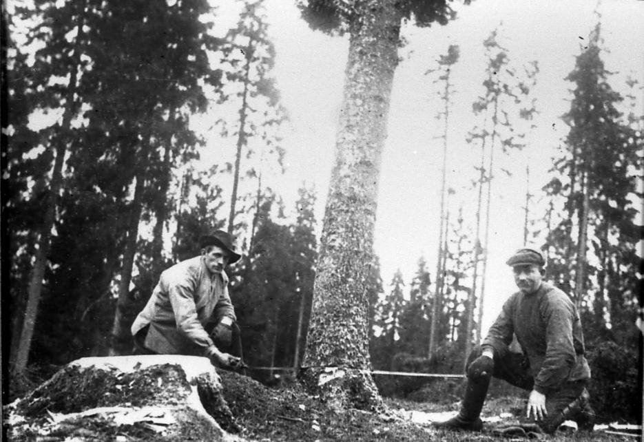 Trädfällning i Slättängs skog. Gustav Vårdén och Edvin Apel.