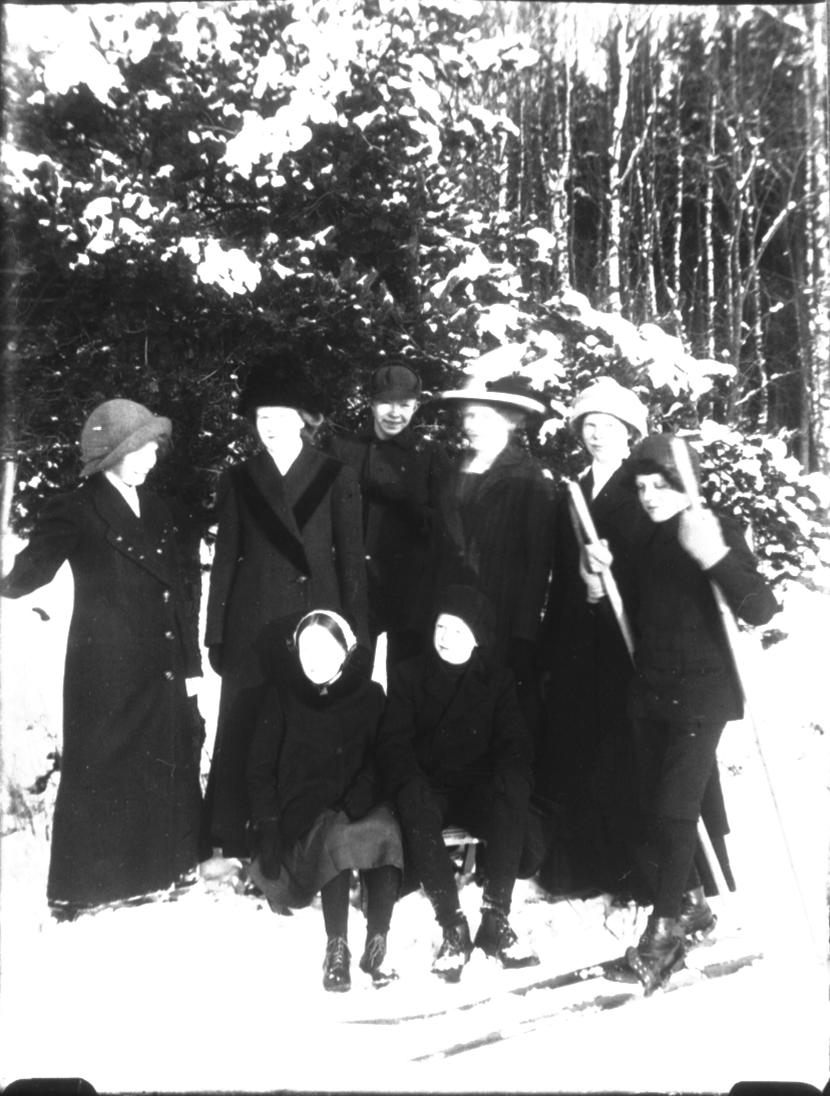Skidåkning. Berta, Elin och Ture på veken, okänd, Hilma på Veken, okänd. Sittande Ebba och Karl på Veken.