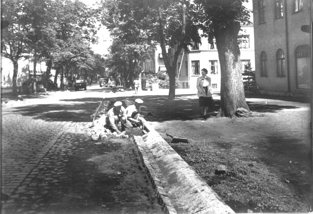 Läggning av en trottoarkant, S:t Olofsgatan.