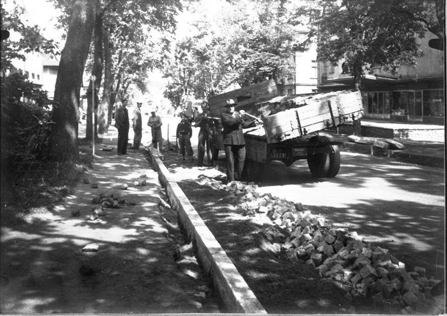 Stenläggning på S:t Olofsgatan. Biografen Roxy t.h.