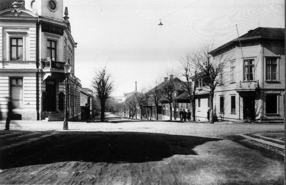 Mot Falköpings södra. T.v. S:t Olofsgatan 5 (Posthuset, Forsska huset, bankhuset) t.h. S:t Olofsgatan 7, Apoteket.