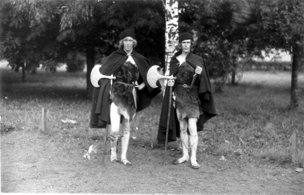 Karneval. Bronsåldersmän, klädda i mantlar, som förfärdigats med den ryktbara manteln som förebild, bär dolkar i bältet samt yxor, vilka är av processionstyp.