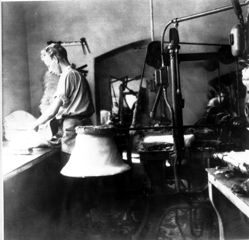 Forss hattfabrik. Filtning av kulle- ullstumpen gnuggas med hjälp av ånga under hög värme.