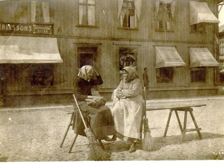 Stora torget. Till vänster "Sope-Mina", till höger "Satta". Fotografiet taget framför Rådmannen, Stora torget 19.