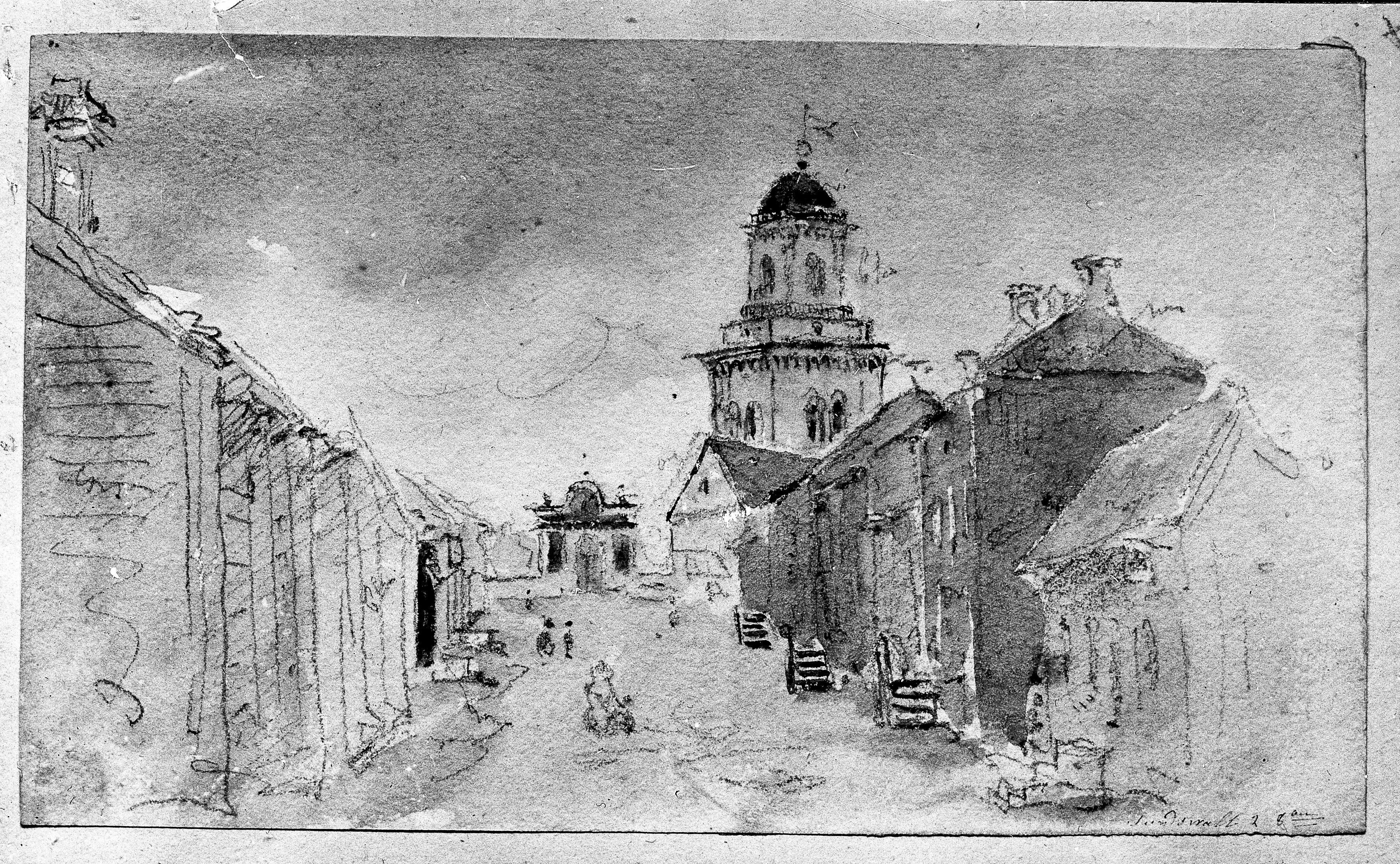 Kyrkan, uppförd 1753, i stadsmiljön, ödelagd av brand 1888. Foto av akvarell från 1839.