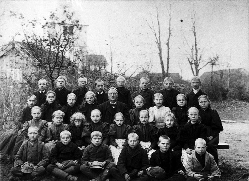 Luttra skola, c:a 1895-1900. Lärare J.A. Lindqvist. 2:a raden nedifrån, 3:e f. vänster: dottern Ester Lindqvist, Luttra.