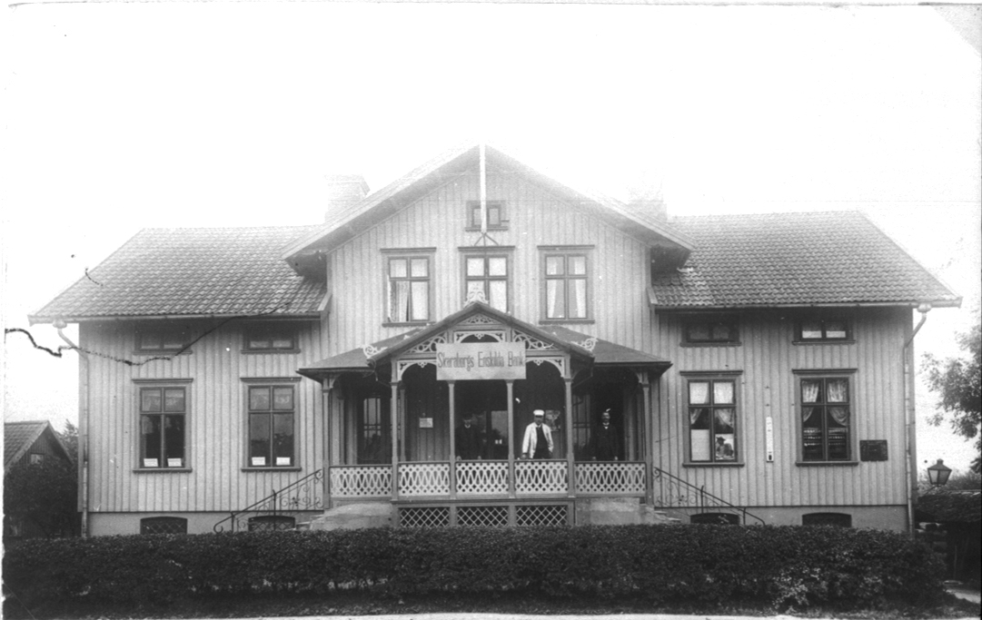 Aspedal, Skaraborgs enskilda bank. T. v. Urmakeri. T.h. från vänster P.A. Svensson, ? Bengtsson och urmakare Lagerstedt.