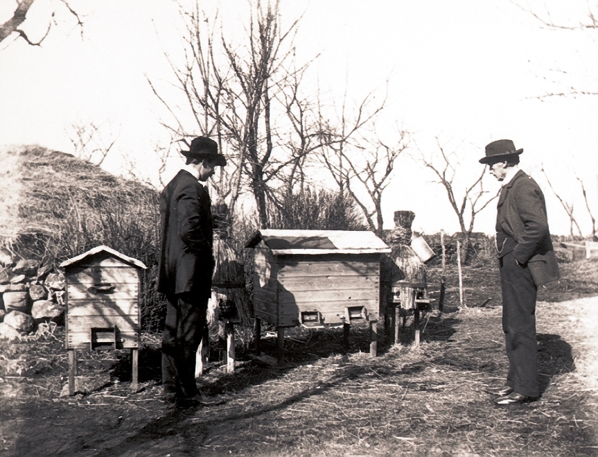 Repslagare Johansson och Alfred Andersson vid bikuporna i Bonnagården.