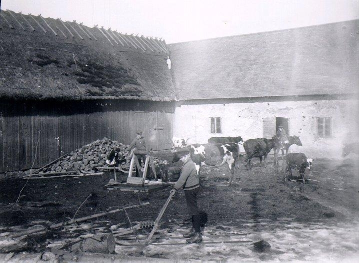 Korna utsläppta för vattning på vårkanten. Storegården Öja.
