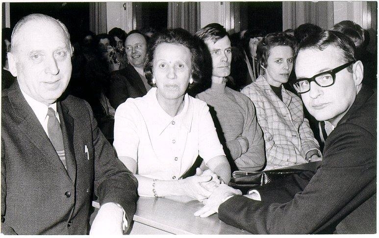 Vid möte med Hem- och Skola i Gudhem. Längst till vänster rektor Richard Andersson, 2:a Birgit Wiberg, 3:a Lennart Johnsson, Västorp, Bolum. 4:e hans fru, i förgrunden snett emot kameran dir. Edgar Nilsson. Vårdanstalten, Gudhem.
