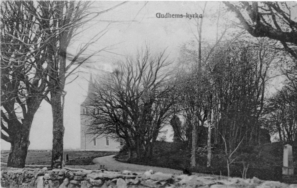 Gudhems kyrka sedd från vägen med ruinerna av klostret till höger.