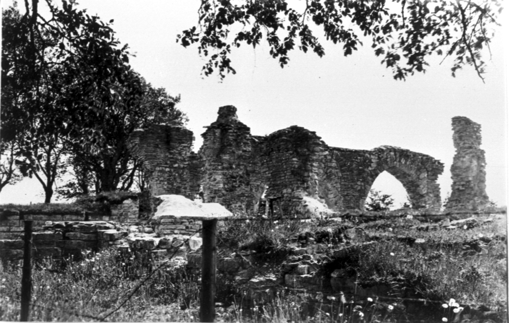 Klosterkyrkans ruiner med de uppstickande bågvalven i n. arkadräckan i långhuset.