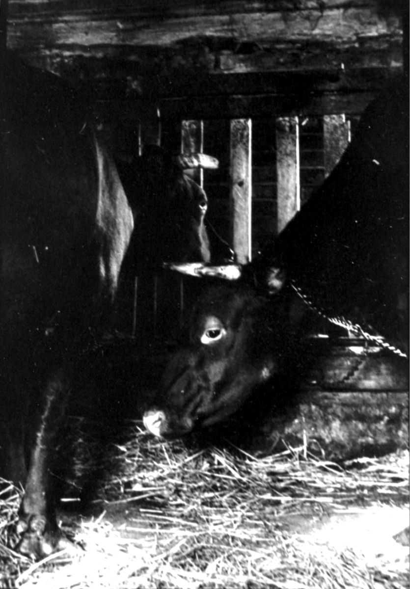 Bossgården. Fähuset med djurbestånd. De små fönstren ger skum belysning.