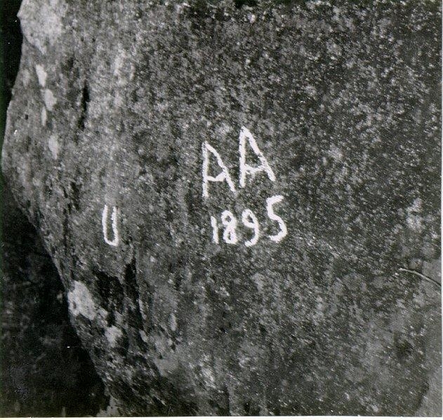 Titel: Hässleberget. Naturminne. Initialer ristade på berg.