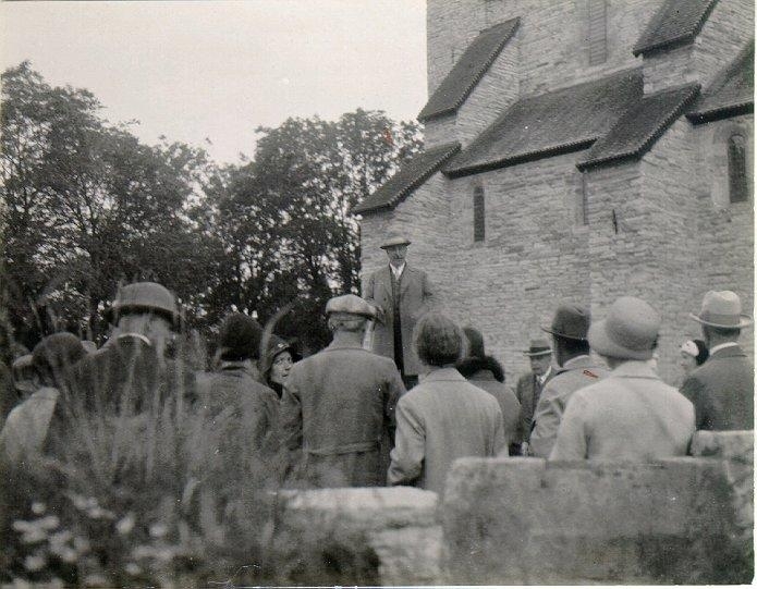Samfundet för hembygdsvård. Utflykt 1931. Riksantikvarie Curman talar vid Varnhems klosterkyrka.