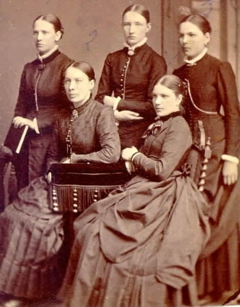 Lärarinnor i Falköpings folkskola.1. Maria Josefsson, 2. Ema Bäckström, 3. Hanna Andersson, 4. Augusta Hallenius, 5. Elisabeth Fälth, syster till Teofil Fälth.
