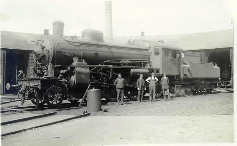 Järnvägare vid ett lok. Fr.v. A. Källström, stallkarl. Sandberg, stallförman. A. Andersson, lokeldare. Sven Ström, lokförare.