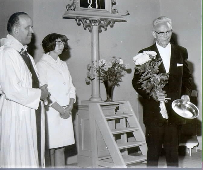Kyrkvaktmästare Hilding Bure avtackas, av Stig Luttermark och Märta Karlsson.