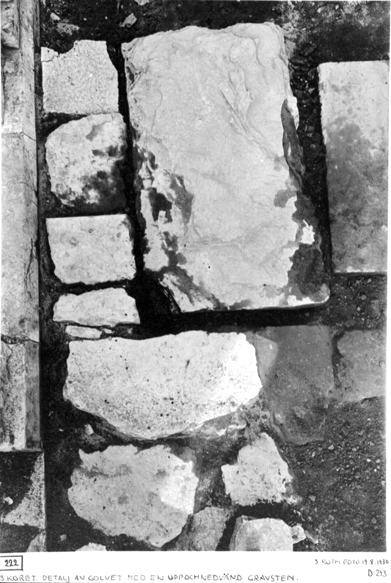 Södra koret. Detalj av golvet med en uppochned gravsten.
