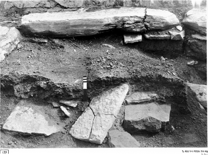 Nordöstra kapellet. från väster. Sakristian. Trägolv med underliggande lager: jord, murbruk.