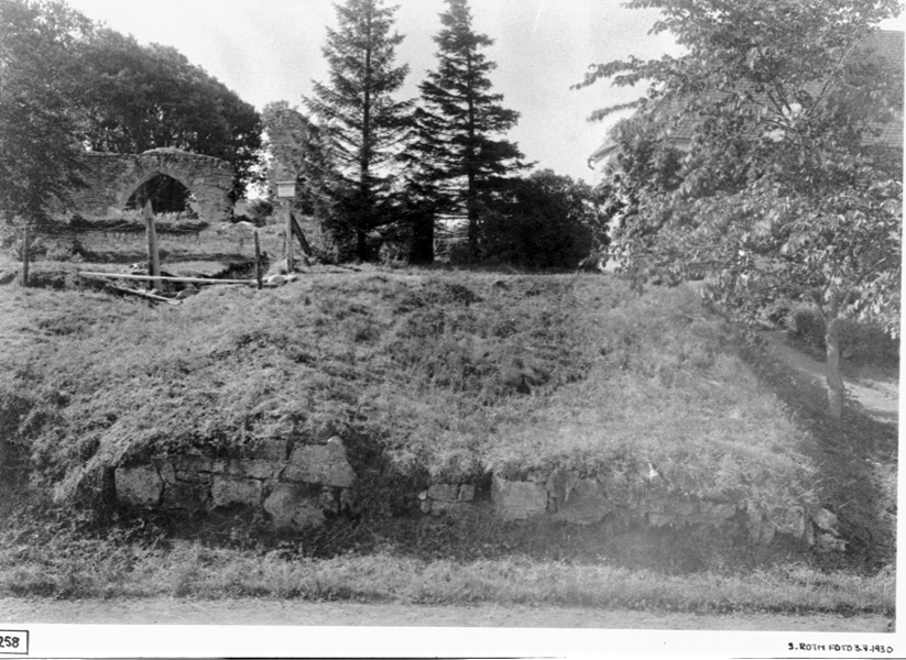 Västligaste delen av klostrets nordmur från norr. Före utgrävningen, abbedissans hus.