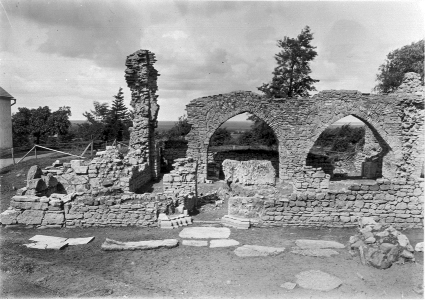 Kyrkan. Långhusets västra del. I mittskeppet kvarligger delar av nedrasad arkadbåge. Foto mot norr.
