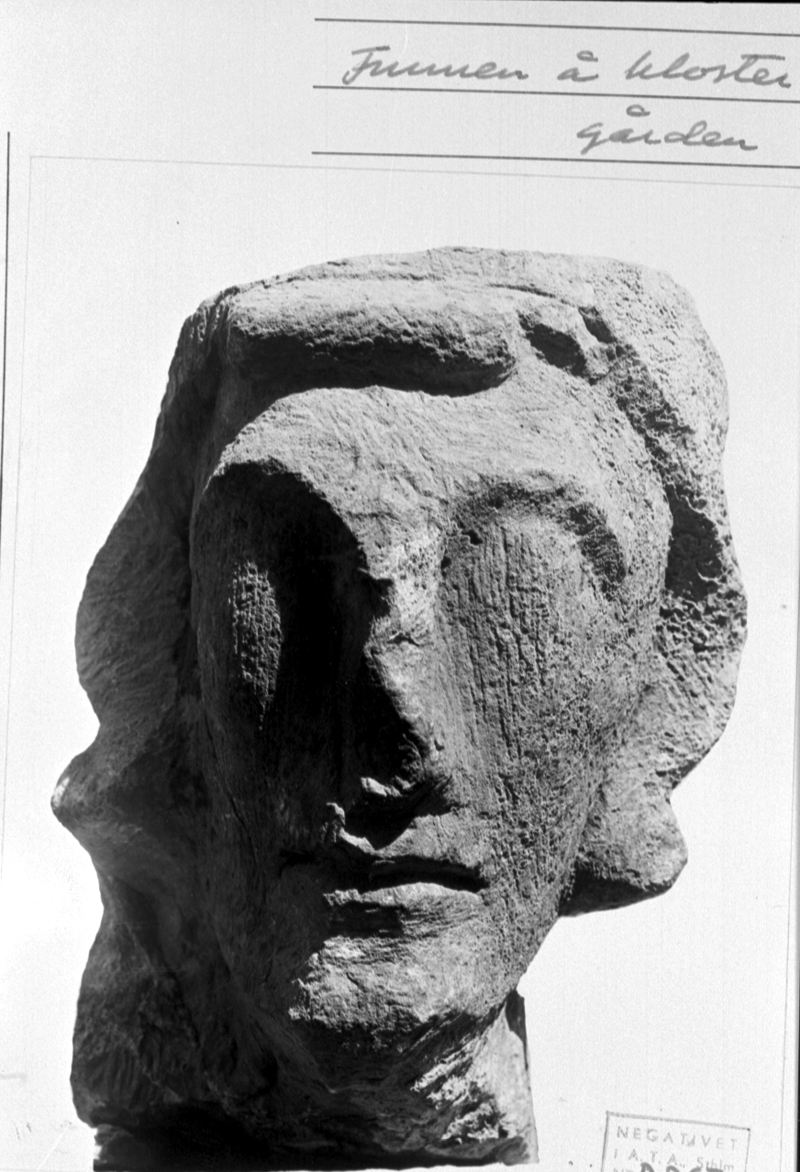 Stendekor. Konsol i form av ynglingahuvud. Funnen på klostergården.