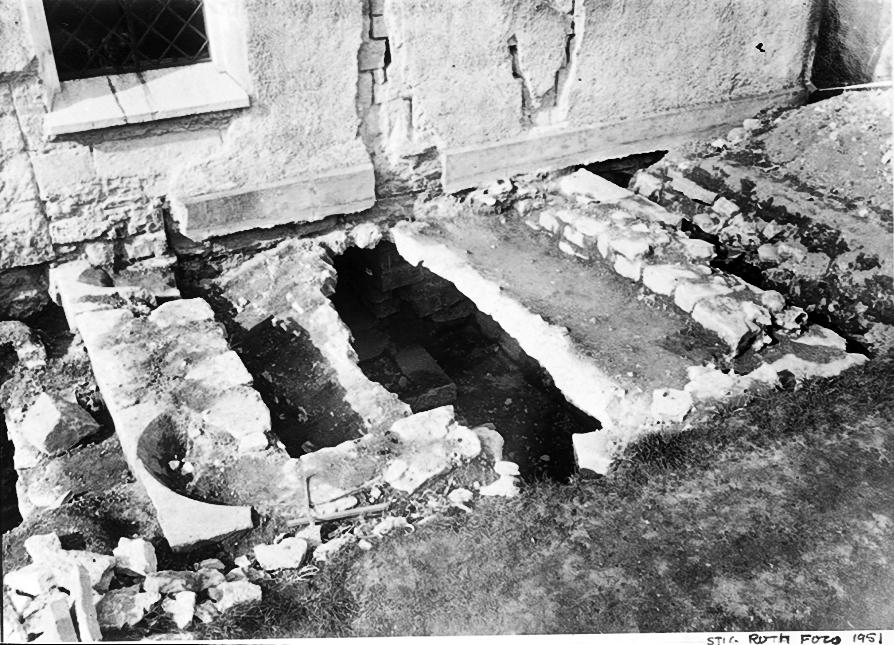 Kyrkans södra mur med Kafleska gravkoret. Rester efter fönster i 1811 års kor. T.v. stenar från klostret. Ytterkanten på gravkorets södra mur grävdes aldrig fram 1951.