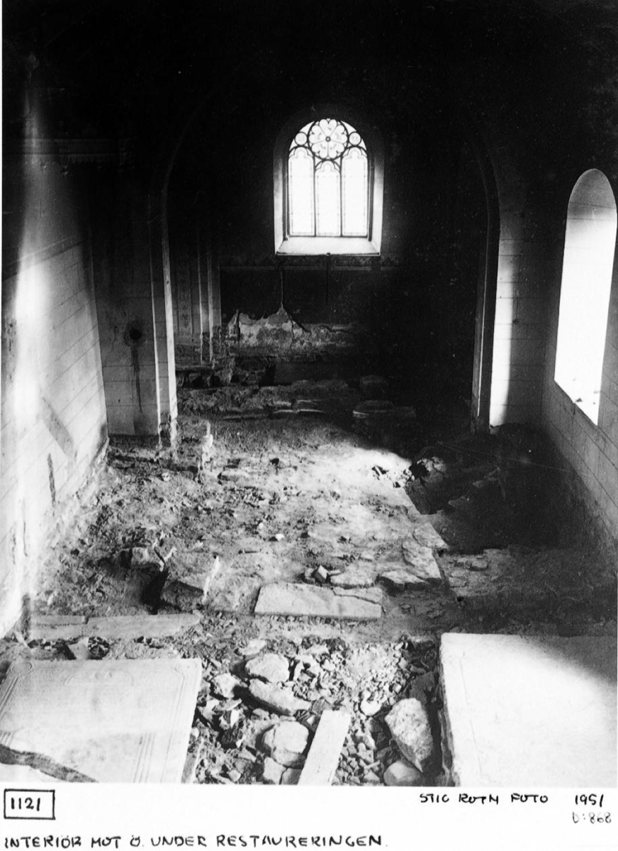 Titel: Interiör mot öster under restaureringen. T.h. kryptan och nedgången till Kafle-Soopska gravvalvet.