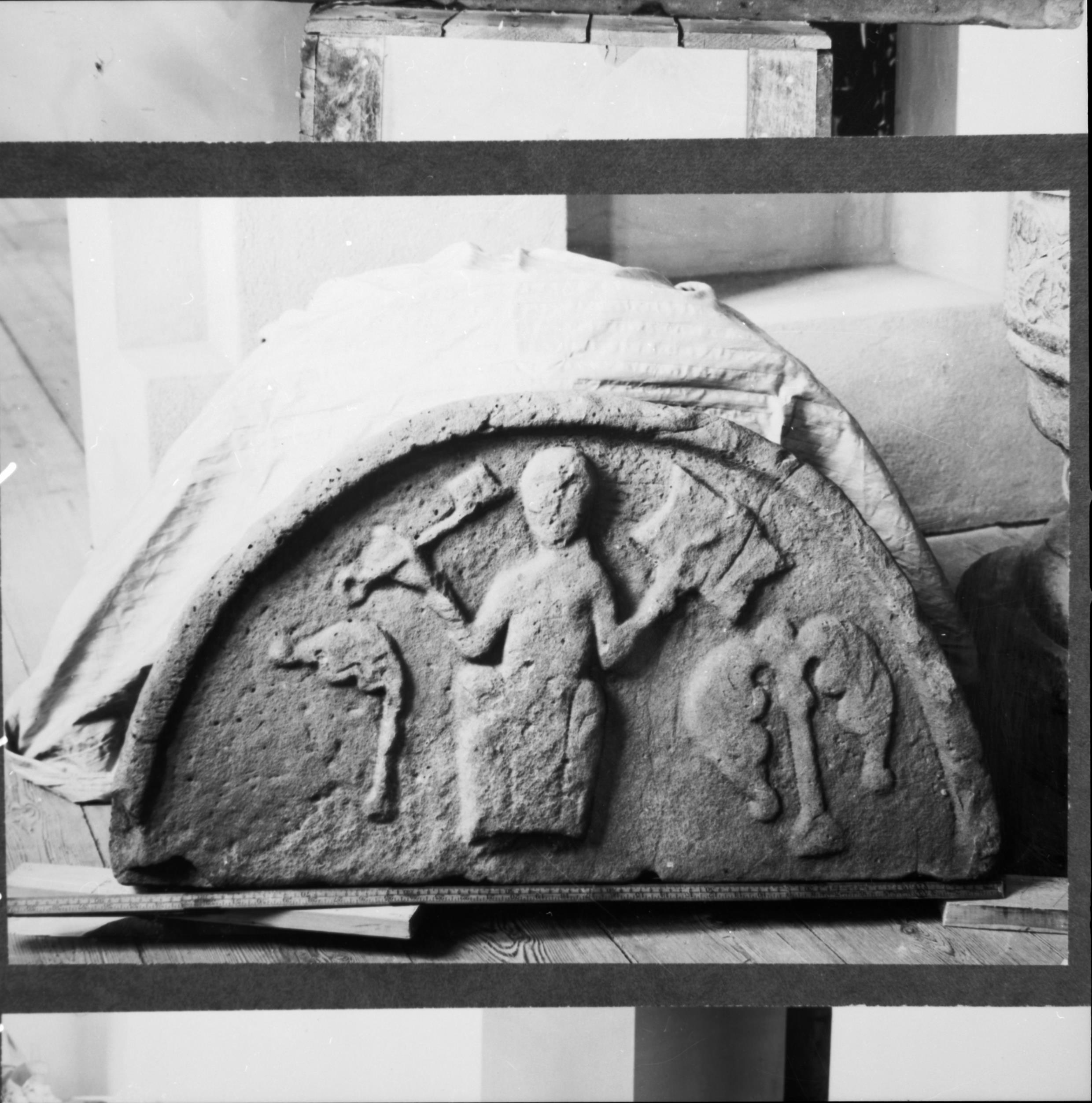 Beskrivning: Tympanon. Kyrkan riven 1868.